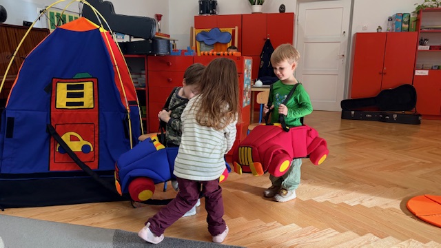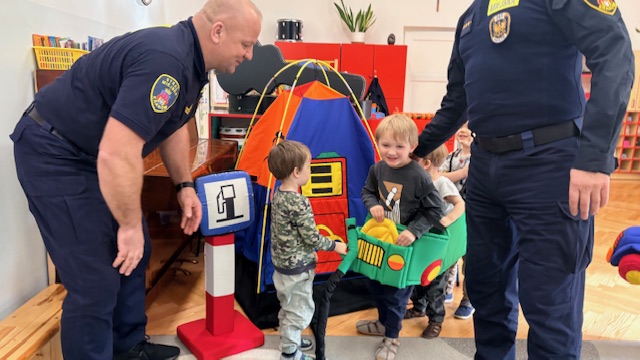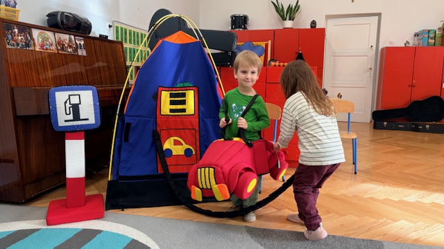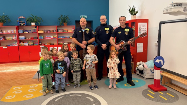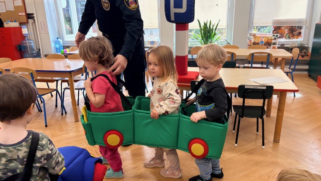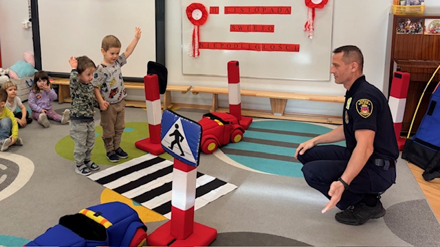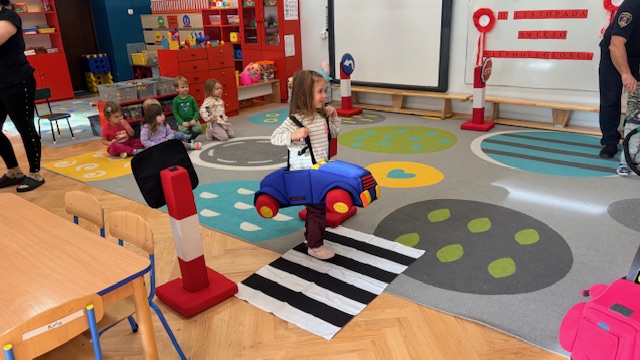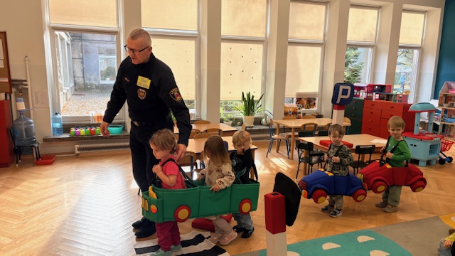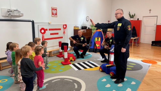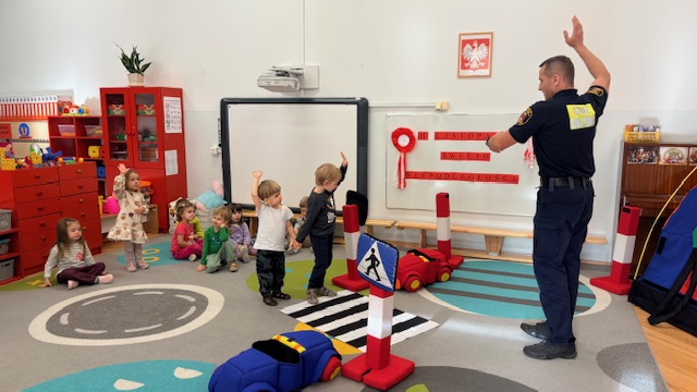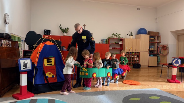 W środę w naszym przedszkolu odbyło się spotkanie edukacyjne grupy I „Misie” ze strażnikami miejskimi. Podczas zajęć dzieci uczyły się, jak bezpiecznie poruszać się po drogach oraz jak prawidłowo przechodzić przez jezdnię. Przedszkolaki poznały wybrane znaki drogowe i ich znaczenie. Najwięcej radości sprawiła dzieciom zabawa na mini ulicy. „Misie” mogły wcielić się w rolę kierowców – jeździły pluszowymi samochodami, zatrzymywały się na znakach, przejściu dla pieszych, jeździły po rondzie oraz… tankowały swoje pojazdy! Dzięki temu w praktyczny sposób utrwalały zasady ruchu drogowego. Niespodzianką dla dzieci była także muzyczna część spotkania. Strażnicy zagrali na gitarach i zaśpiewali piosenki o bezpieczeństwie, a dzieci uczyły się nowych melodii i śpiewały razem z nimi. Spotkanie było nie tylko świetną zabawą, ale przede wszystkim wartościową lekcją bezpieczeństwa.